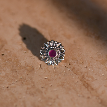 Inspired by the resilient beauty of its namesake flower, the Dahlia nose pin is a masterpiece of artisanal craftsmanship. This piece features a vibrant, lab-grown ruby centerpiece nestled within a sunburst of sterling silver petals. Each detail is designed to celebrate inner strength and timeless grace, making it the perfect signature accessory for the modern woman with a vintage soul.
