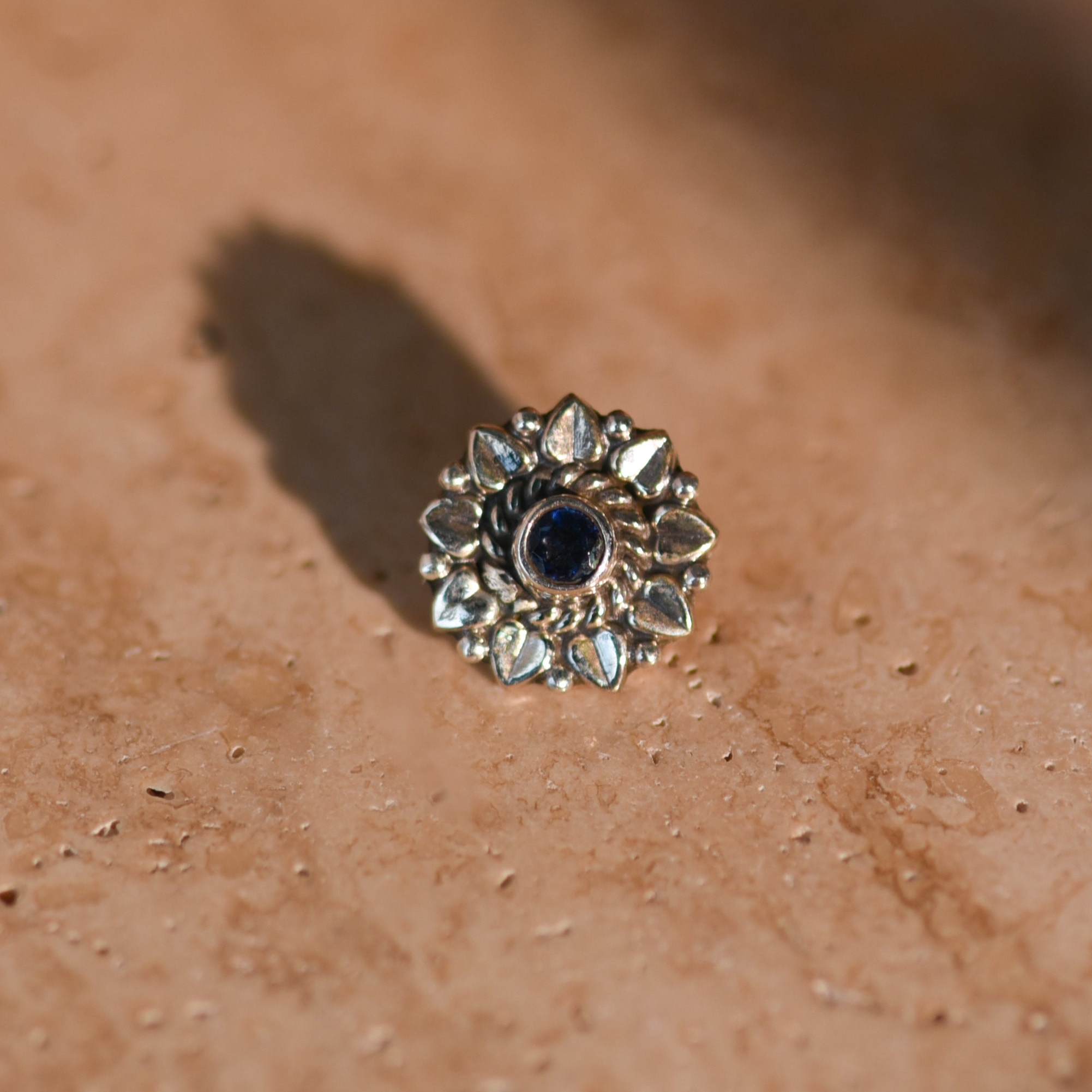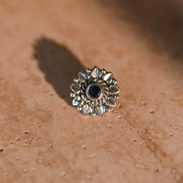 Inspired by the resilient beauty of its namesake flower, the Dahlia nose pin is a masterpiece of artisanal craftsmanship. This piece features a vibrant, lab-grown Sapphire centerpiece nestled within a sunburst of sterling silver petals. Each detail is designed to celebrate inner strength and timeless grace, making it the perfect signature accessory for the modern woman with a vintage soul