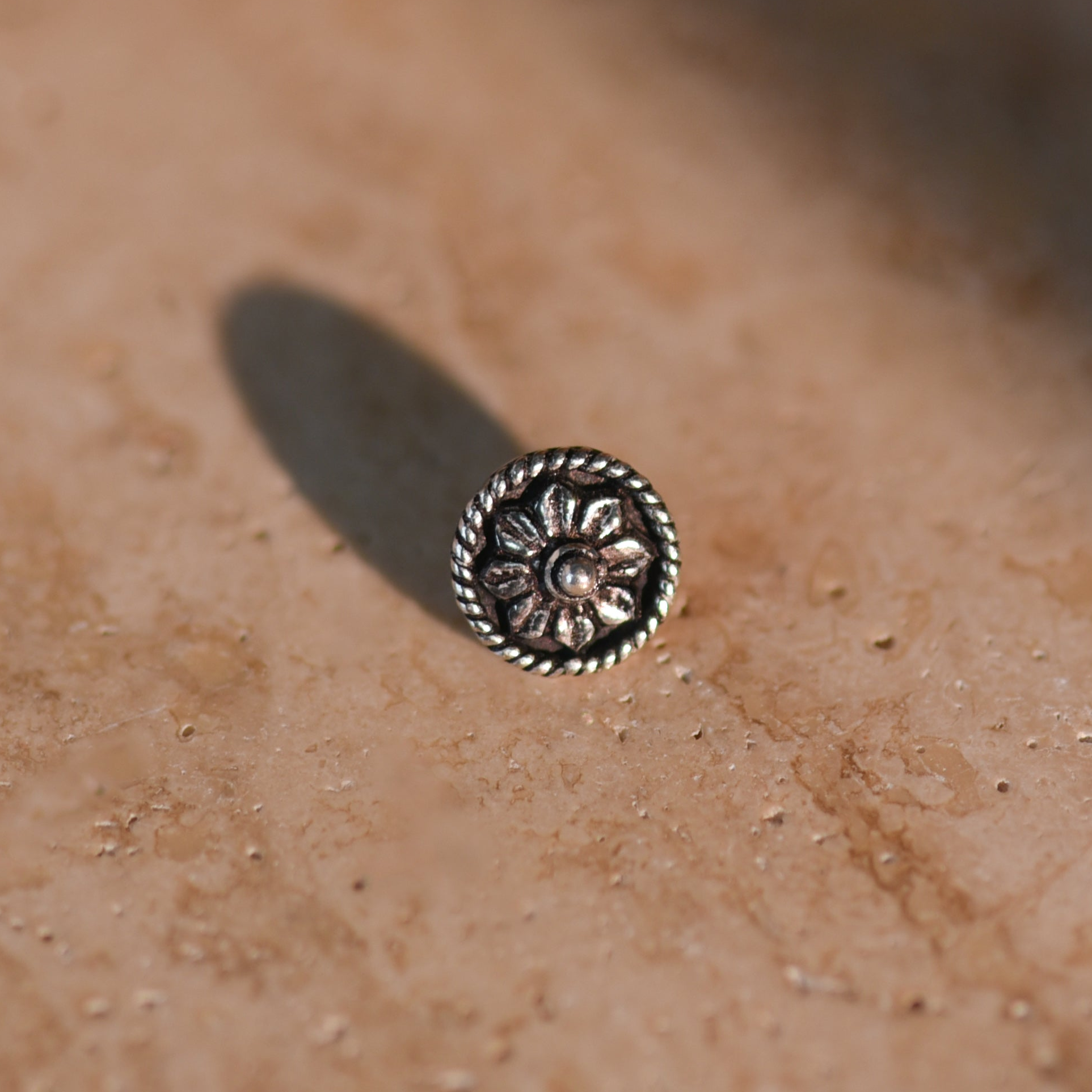 Pushpita – The Radiant Bloom Embrace the elegance of nature with the Pushpita Nosepin, a name that signifies a flower in its fullest bloom. At its heart lies a meticulously sculpted floral motif with delicate, raised petals that capture the spirit of a lotus. This central beauty is perfectly framed by a classic outer border of twisted silver ropework, creating a sophisticated play of light and shadow. The oxidized finish adds a vintage, antique depth, making it an elegant tribute to timeless Indian craftsmanship.
