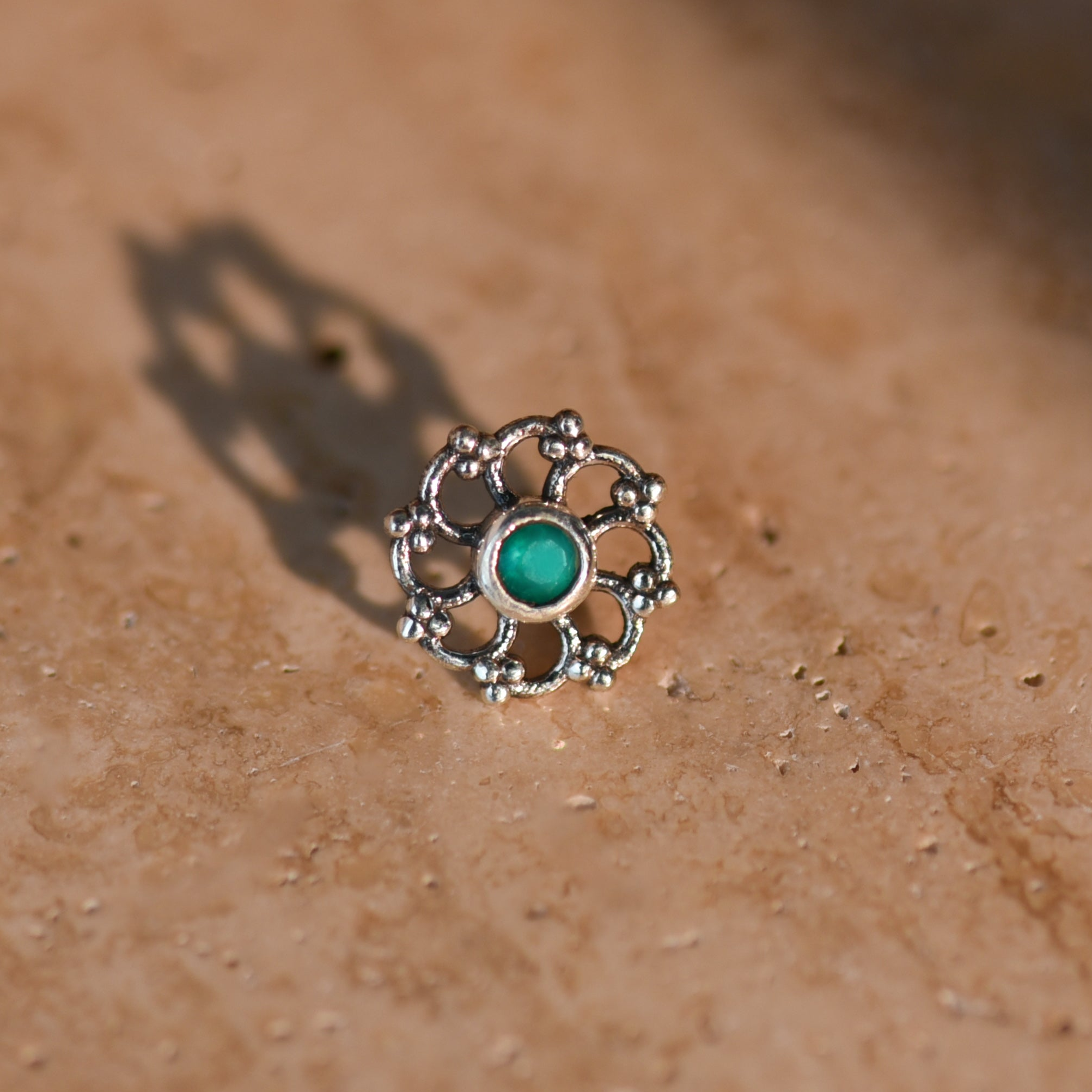 Filigree Work Nosepin, Bold meets delicate in our Taarika Nosepin. Featuring a striking bright Emerald central stone framed by an open-work silver floral motif, this piece offers a beautiful play on light and shadow. The oxidized finish adds a vintage charm, making it a versatile accessory that pairs as beautifully with a crisp white shirt as it does with a traditional silk saree.
