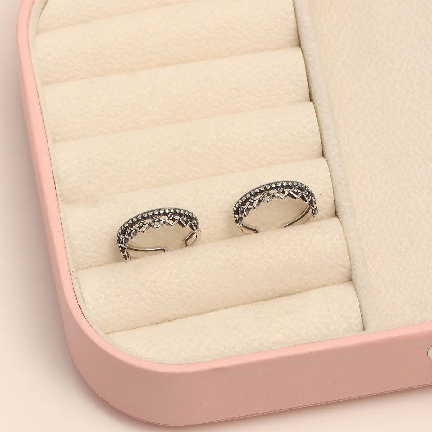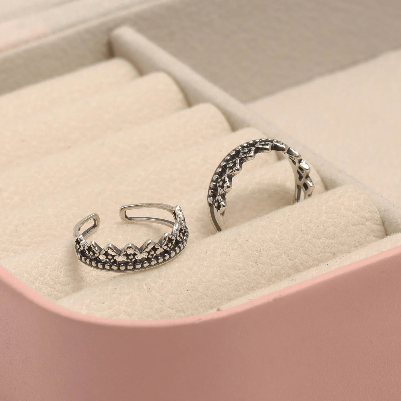 Crafted in 925 sterling silver, this oxidized toe ring features a crown-inspired zigzag pattern. Its antique finish and detailed texture add a bold traditional flair. Perfect for ethnic wear or boho styling.