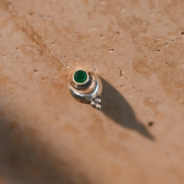 The Emerald Kokila nose pin is a tribute to the "Kokila" (the Indian Cuckoo), celebrated in folklore for its enchanting presence. This piece breaks away from traditional flat designs, featuring a bold, three-dimensional crescent-moon silhouette in polished sterling silver. At its heart lies a deep, forest-green emerald-toned cabochon, representing the lush landscapes where the Kokila sings. It is a piece for the woman who finds beauty in the organic and the extraordinary.